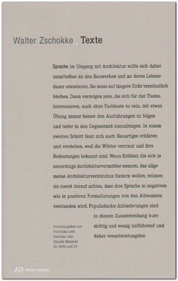 Zschokke veröffentlichte zahlreiche Bücher, schrieb aber auch architekturkritische Texte, deren Aktualität ungebrochen ist u.a. für die Tageszeitung "Die Presse" und für "Werk, Bauen + Wohnen". Dies ist die erste Sammlung von Texten Zschokkes. Aus der Vielfalt seiner brillanten Analysen liegt eine Auswahl vor, die durch bisher unveröffentlichte Arbeiten sowie durch Aufsätze von Toni Häfliger und Otto Kapfinger, beide Wegbegleiter und Vertraute Zschokkes, ergänzt wird. Die bekannte Architekturfotografin Margherita Spiluttini steuert einen atmosphärischen Fotoessay zu Zschokkes akribisch aufbereitetem Textarchiv bei.